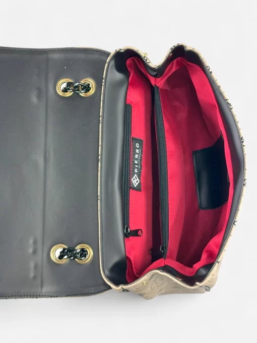 Η τσάντα διαθέτει μεταλλική αλυσίδα για τον ώμο, προσφέροντας στιβαρότητα αλλά και μια μοντέρνα πινελιά στο σύνολο. Το καπάκι της κλείνει με μαγνητικό κούμπωμα, διασφαλίζοντας την ασφάλεια των προσωπικών σας αντικειμένων. Στο εσωτερικό της τσάντας, υπάρχει μία πρακτική διαχωριστική θέση, ιδανική για την οργάνωση των αντικειμένων σας, όπως πορτοφόλι, κινητό ή άλλα απαραίτητα μικροαντικείμενα.