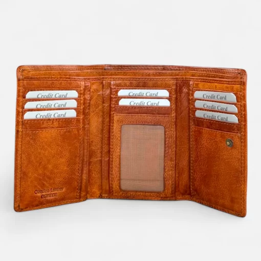 Ανακαλύψτε αυτό το κομψό γυναικείο πορτοφόλι σε Κονιάκ χρώμα, ιδανικό για κάθε γυναίκα που αναζητά ποιότητα και στυλ. Κατασκευασμένο από γνήσιο φυσικό δέρμα μεγάλης αντοχής, προσφέρει πρακτικότητα και πολυτέλεια σε κάθε χρήση.
