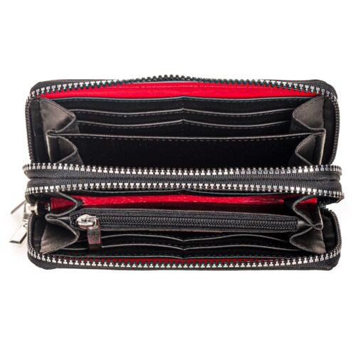 • Εσωτερική διάταξη: Κάθε τμήμα του πορτοφολιού περιλαμβάνει πολλαπλές θήκες για κάρτες, θέση για χαρτονομίσματα, και ξεχωριστές θήκες για κέρματα ή μικρότερα αντικείμενα, εξασφαλίζοντας τέλεια οργάνωση.
