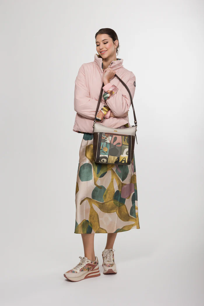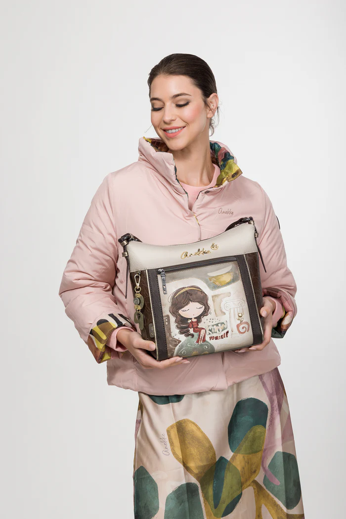 Ο σχεδιασμός της τσάντας ξεχωρίζει χάρη στο καλλιτεχνικό print με τη χαρακτηριστική φιγούρα της Anekke και τα διακοσμητικά στοιχεία που θυμίζουν έργα τέχνης. Παράλληλα, οι γήινες αποχρώσεις, οι μεταλλικές λεπτομέρειες και τα προσεγμένα υλικά δημιουργούν ένα κομψό αποτέλεσμα που ταιριάζει ιδανικά στην καθημερινότητα.