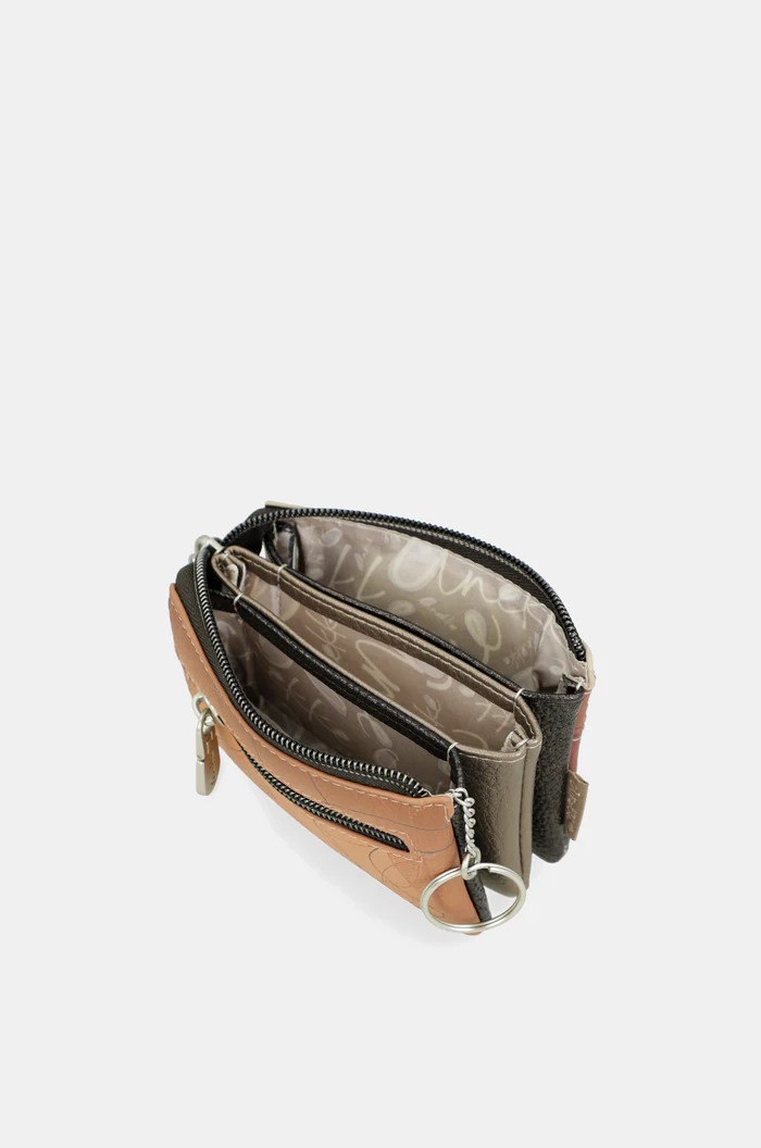 Το μπροστινό μέρος του πορτοφολιού ξεχωρίζει χάρη στο ιδιαίτερο patchwork design που συνδυάζει διαφορετικές υφές και χρώματα. Οι γεωμετρικές γραμμές, τα μεταλλικά στοιχεία και οι μικρές διακοσμητικές λεπτομέρειες δημιουργούν ένα μοντέρνο αποτέλεσμα που κάνει το πορτοφόλι να ξεχωρίζει.