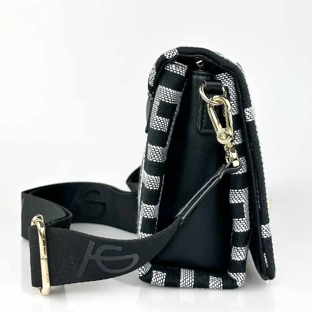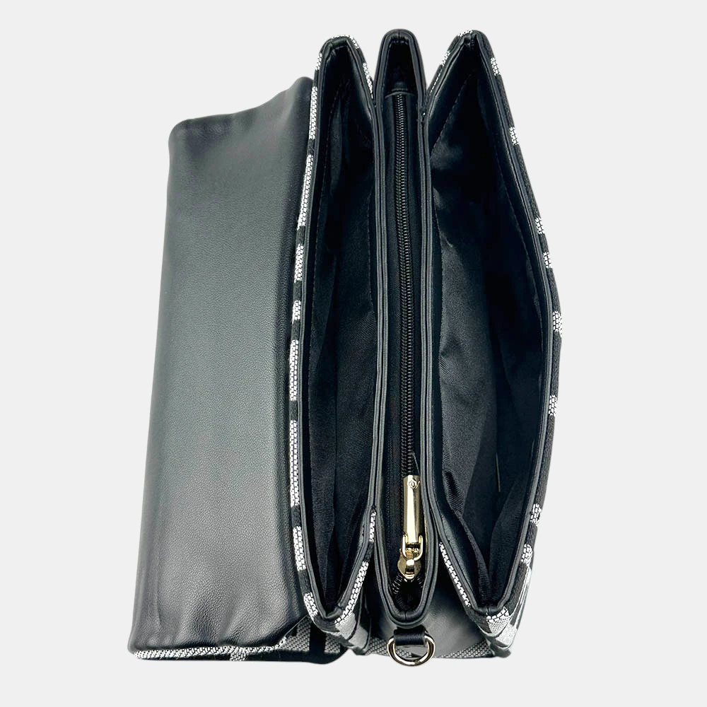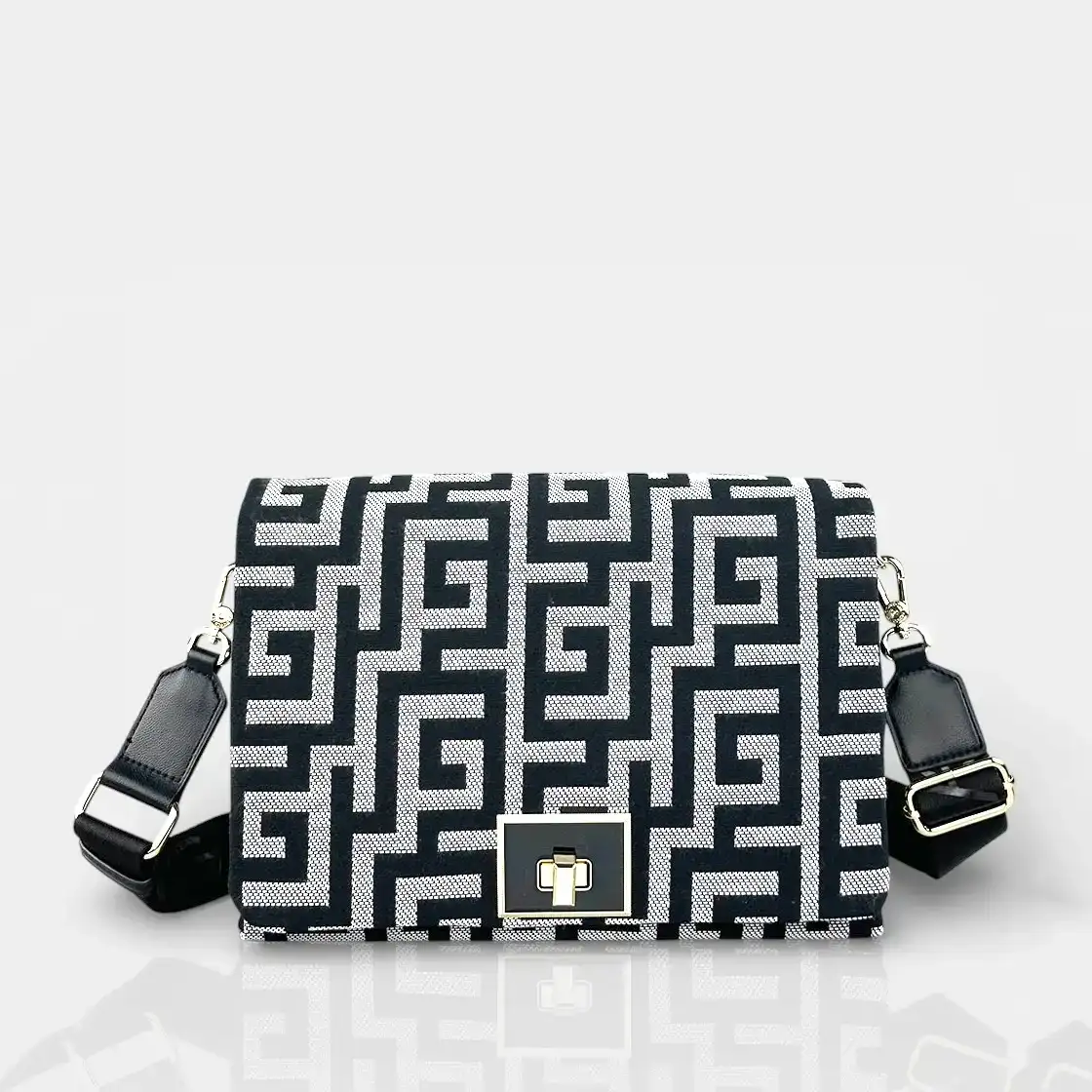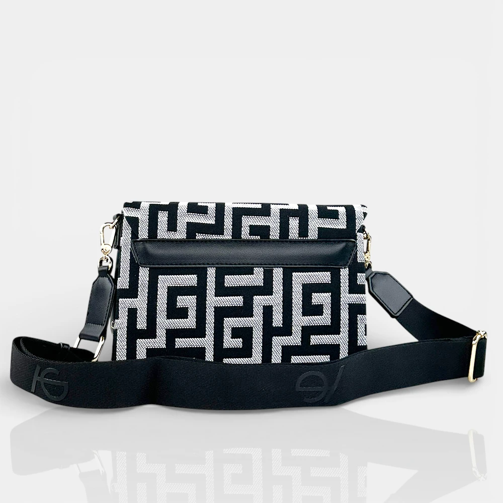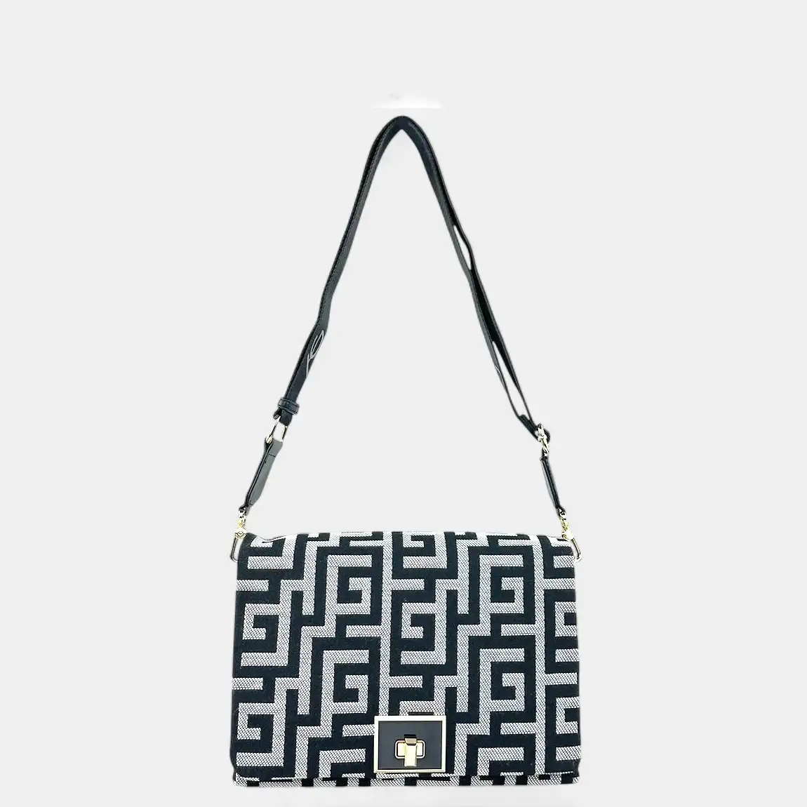 Η γυναικεία τσάντα ώμου και χιαστί Ari Gorgio AG2301-01 από ανθεκτικό μαύρο καμβά με διακριτικό σχέδιο μαίανδρου, προσφέρει στυλ και οργάνωση σε compact μέγεθος με 3 ξεχωριστές θέσεις.