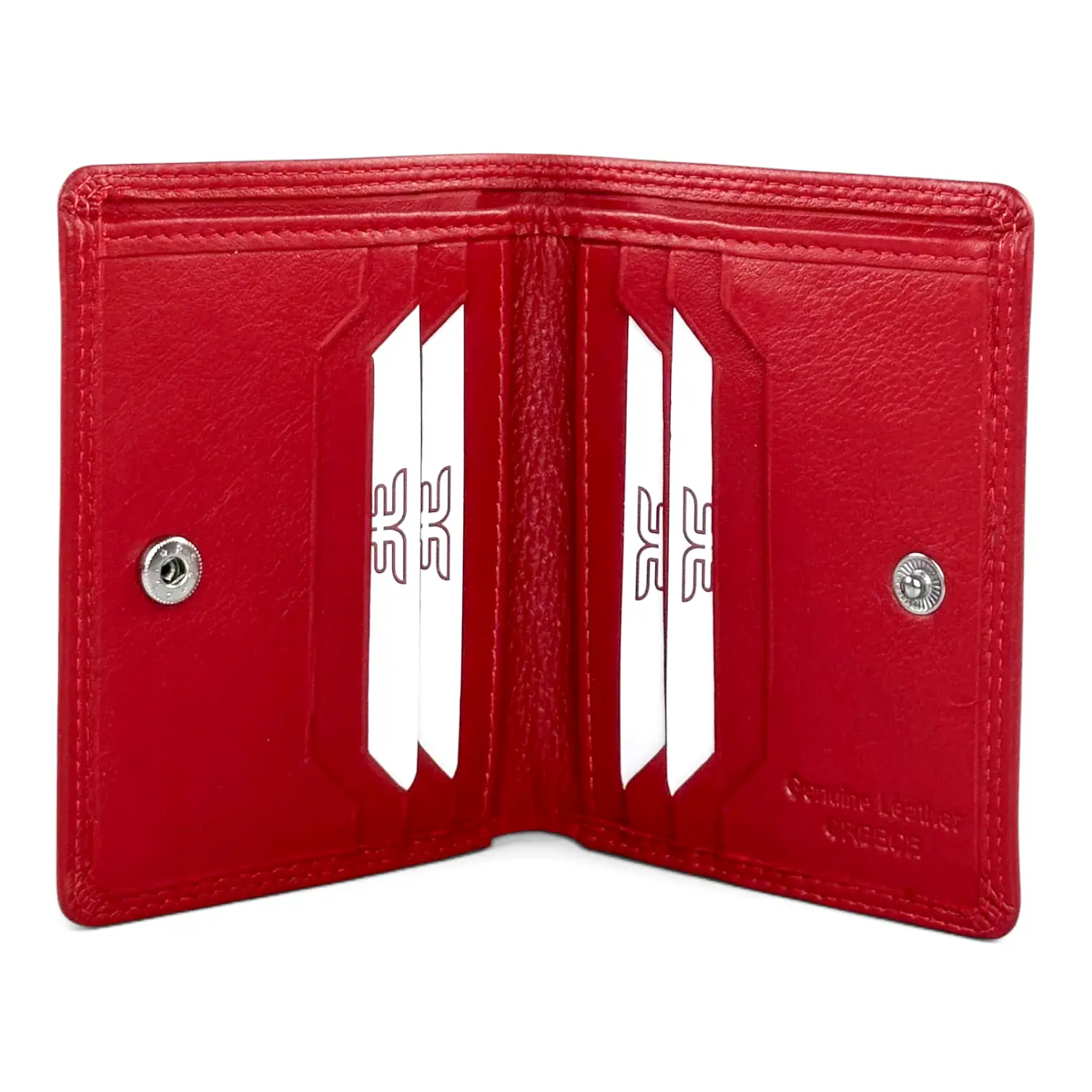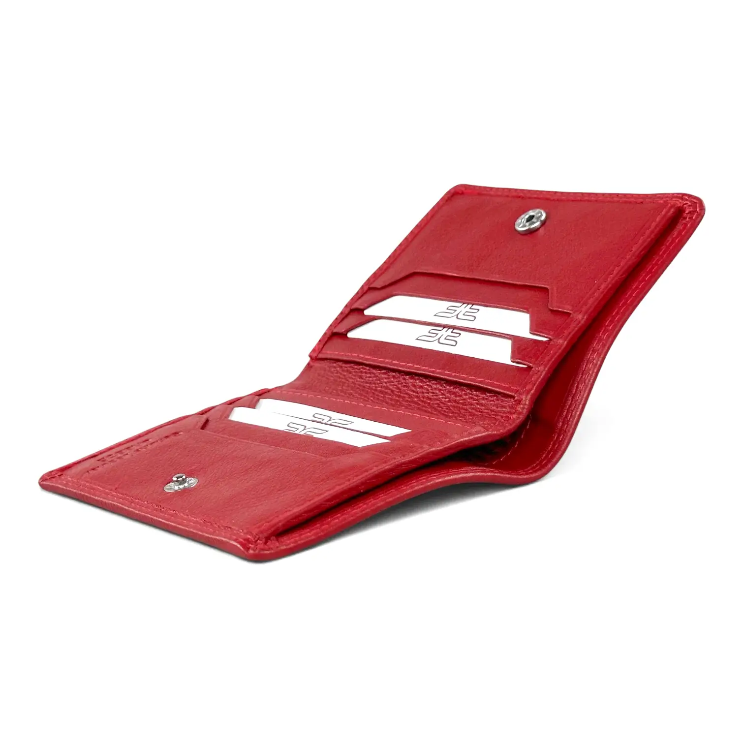 Το bifold άνοιγμα αποκαλύπτει δύο συμμετρικά φύλλα με 4 θέσεις κάρτες σε κάθε φύλλο — συνολικά 8 κάρτες. Κάθε φύλλο κλείνει με magnetic κούμπωμα για ασφαλή φύλαξη. Ανάμεσα στα δύο φύλλα, μια θέση για χαρτονομίσματα διπλωμένα — η μόνη αναγκαία παραχώρηση σε ένα αμιγώς minimalist σχεδιασμό.