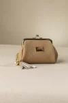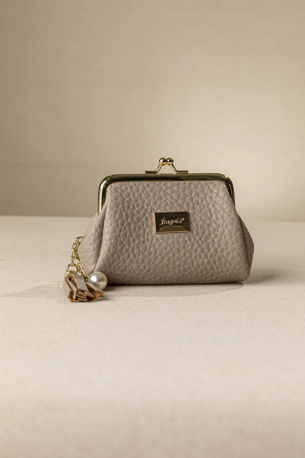 Φοδραρισμένη κερματοθήκη με έναν ενιαίο χώρο που κλείνει με μεταλλικό στόμιο. Διακοσμητική φούντα από συνθετικό υλικό και πέρλα, που προσδίδει κάτι ξεχωριστό και χαριτωμένο.