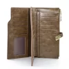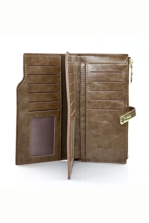 Μεγάλο πορτοφόλι που κλείνει με καπάκι με μαγνητικό μπουτόν. Διαθέτε πολλές θήκες για κάρτες και μεγάλη θήκη για χαρτονομίσματα. Εξωτερική θήκη με φερμουάρ για τα ψιλά με διαχωριστικό με έξτρα θήκη με φερμουάρ. Υλικό: Συνθετικό δέρμα με μαλακή υφή.