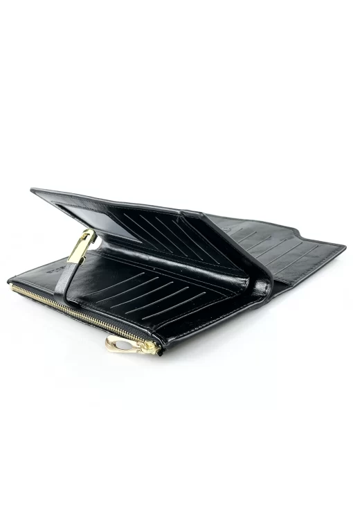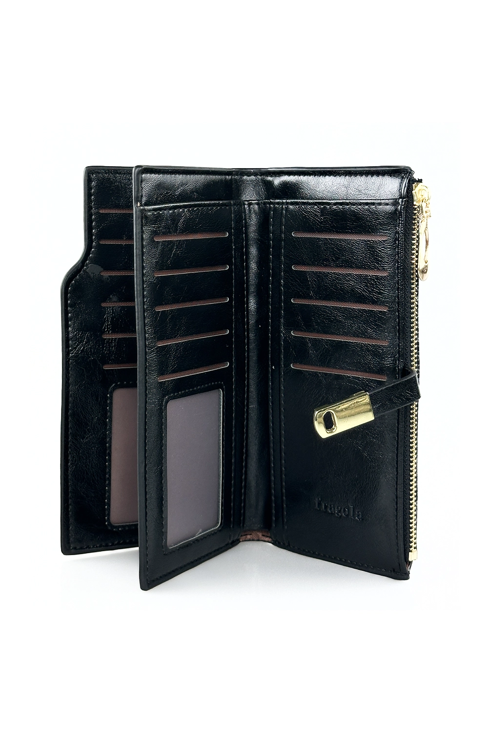 Μεγάλο πορτοφόλι που κλείνει με καπάκι με μαγνητικό μπουτόν. Διαθέτε πολλές θήκες για κάρτες και μεγάλη θήκη για χαρτονομίσματα. Εξωτερική θήκη με φερμουάρ για τα ψιλά με διαχωριστικό με έξτρα θήκη με φερμουάρ. Υλικό: Συνθετικό δέρμα με μαλακή υφή.