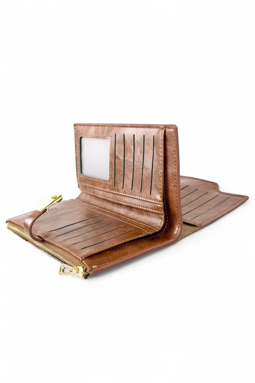 Μεγάλο πορτοφόλι που κλείνει με καπάκι με μαγνητικό μπουτόν. Διαθέτε πολλές θήκες για κάρτες και μεγάλη θήκη για χαρτονομίσματα. Εξωτερική θήκη με φερμουάρ για τα ψιλά με διαχωριστικό με έξτρα θήκη με φερμουάρ. Υλικό: Συνθετικό δέρμα με μαλακή υφή.