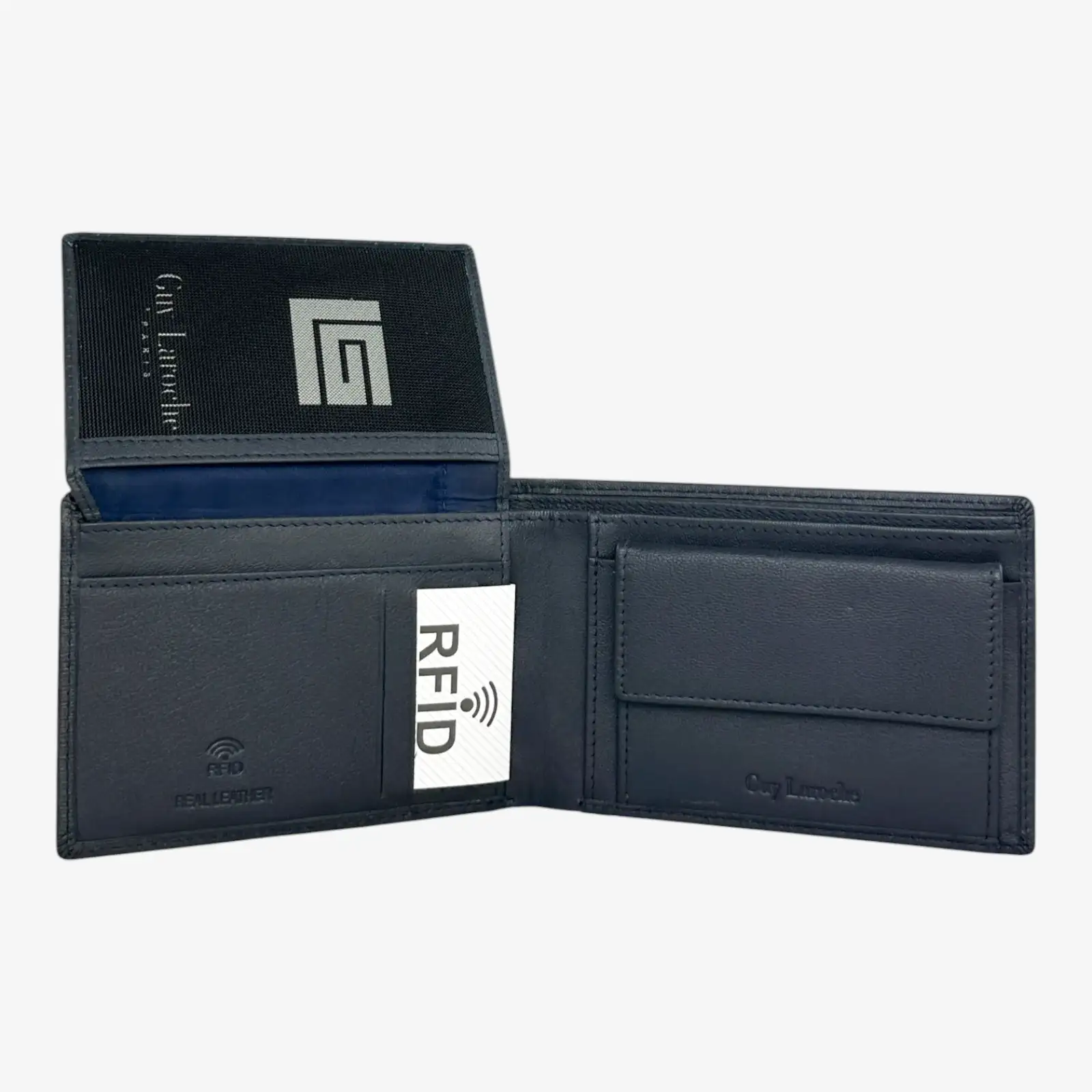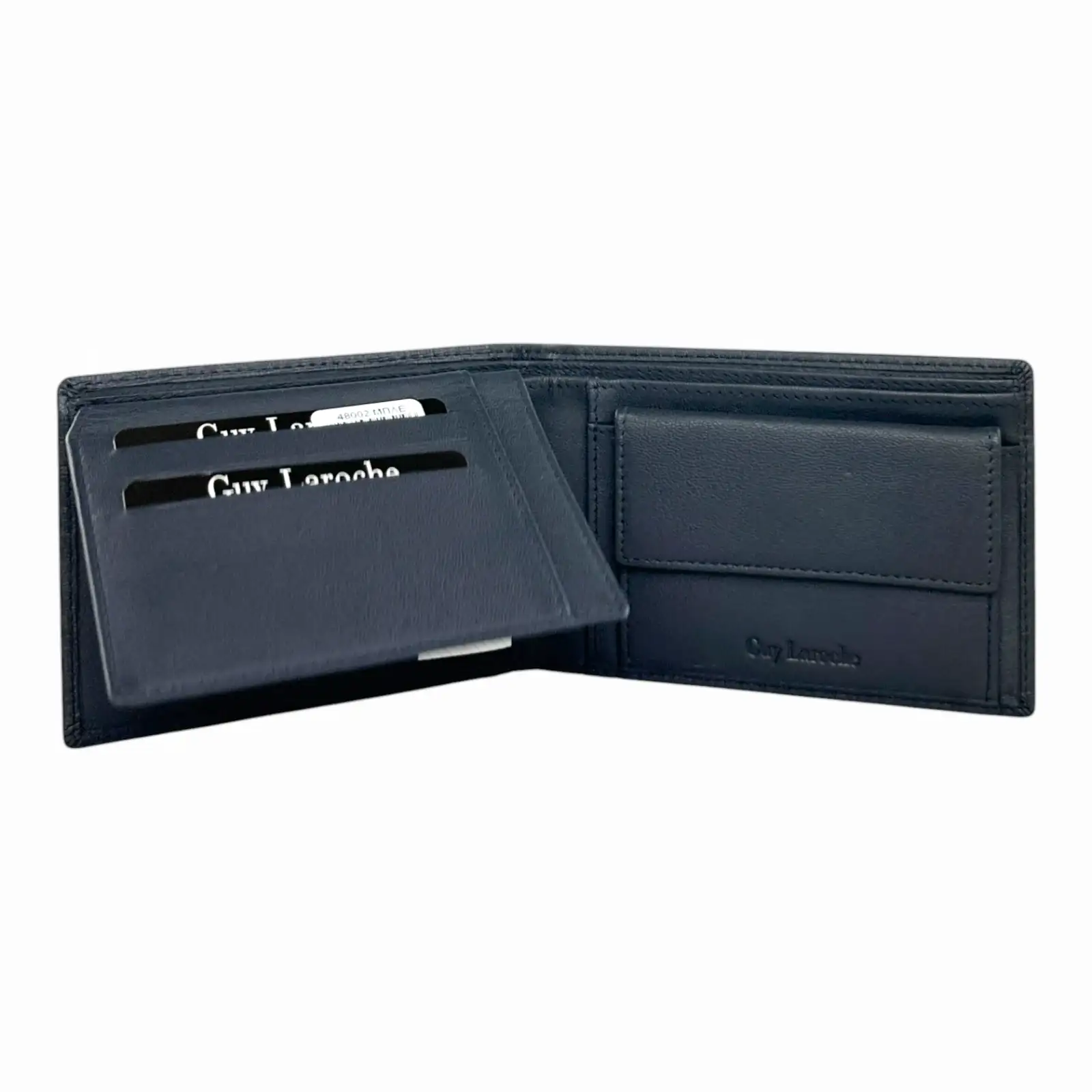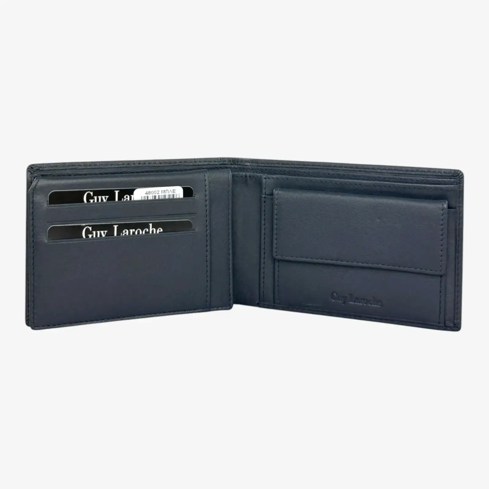 Πολυτελές ανδρικό πορτοφόλι Guy Laroche 48402 σε βαθύ μπλε χρώμα, από αυθεντικό μοσχαρίσιο δέρμα. Διαθέτει 7 θέσεις για κάρτες, 2 θέσεις χαρτονομισμάτων, 3 εσωτερικές θέσεις, θήκη ταυτότητας και τσέπη κερμάτων. Διαστάσεις: Μήκος: 13cm | Πλάτος: 2cm | Ύψος: 9,5cm.