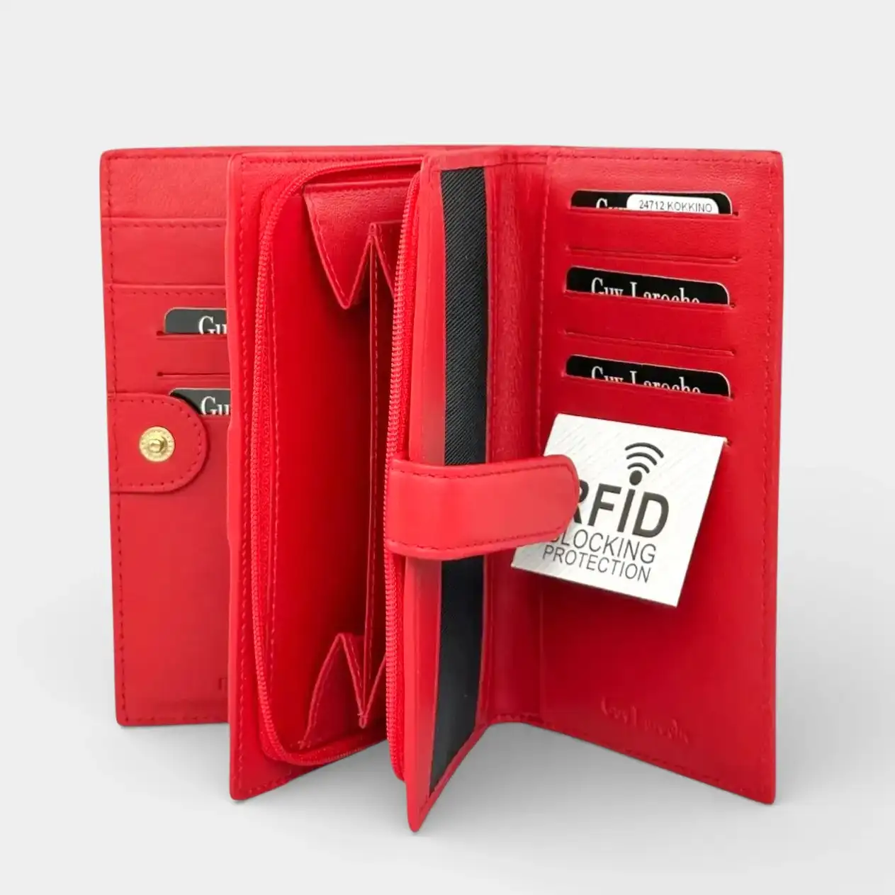 Κομψό γυναικείο πορτοφόλι Guy Laroche 24712 σε ζωηρό κόκκινο χρώμα, από γνήσιο δέρμα. Διαθέτει 12 θέσεις για κάρτες, 2 θέσεις χαρτονομισμάτων και ευρύχωρο εξωτερικό φερμουάρ. Διαστάσεις: Μήκος: 16cm | Πλάτος: 3cm | Ύψος: 10cm.