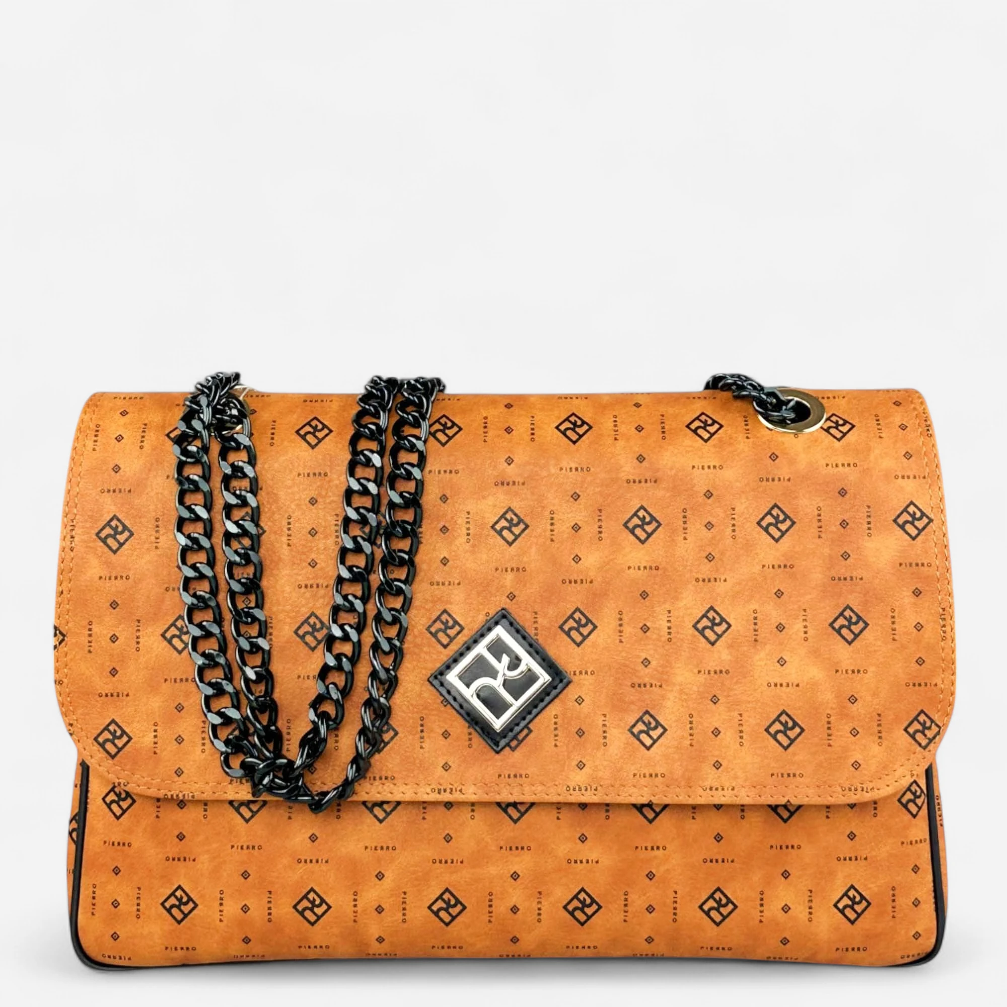 Αυτή η τσάντα ώμου σε ταμπα χρώμα με αλυσίδα και καπάκι από τη σειρά Monogram της εταιρείας Pierro Accessories αποτελεί ιδανική επιλογή για τη σύγχρονη γυναίκα που επιθυμεί να συνδυάσει κομψότητα και πρακτικότητα. Κατασκευασμένη από υψηλής ποιότητας συνθετικό δέρμα, αυτή η τσάντα ξεχωρίζει για το χαρακτηριστικό της μοτίβο monogram, το οποίο δίνει μια διαχρονική αίσθηση πολυτέλειας.