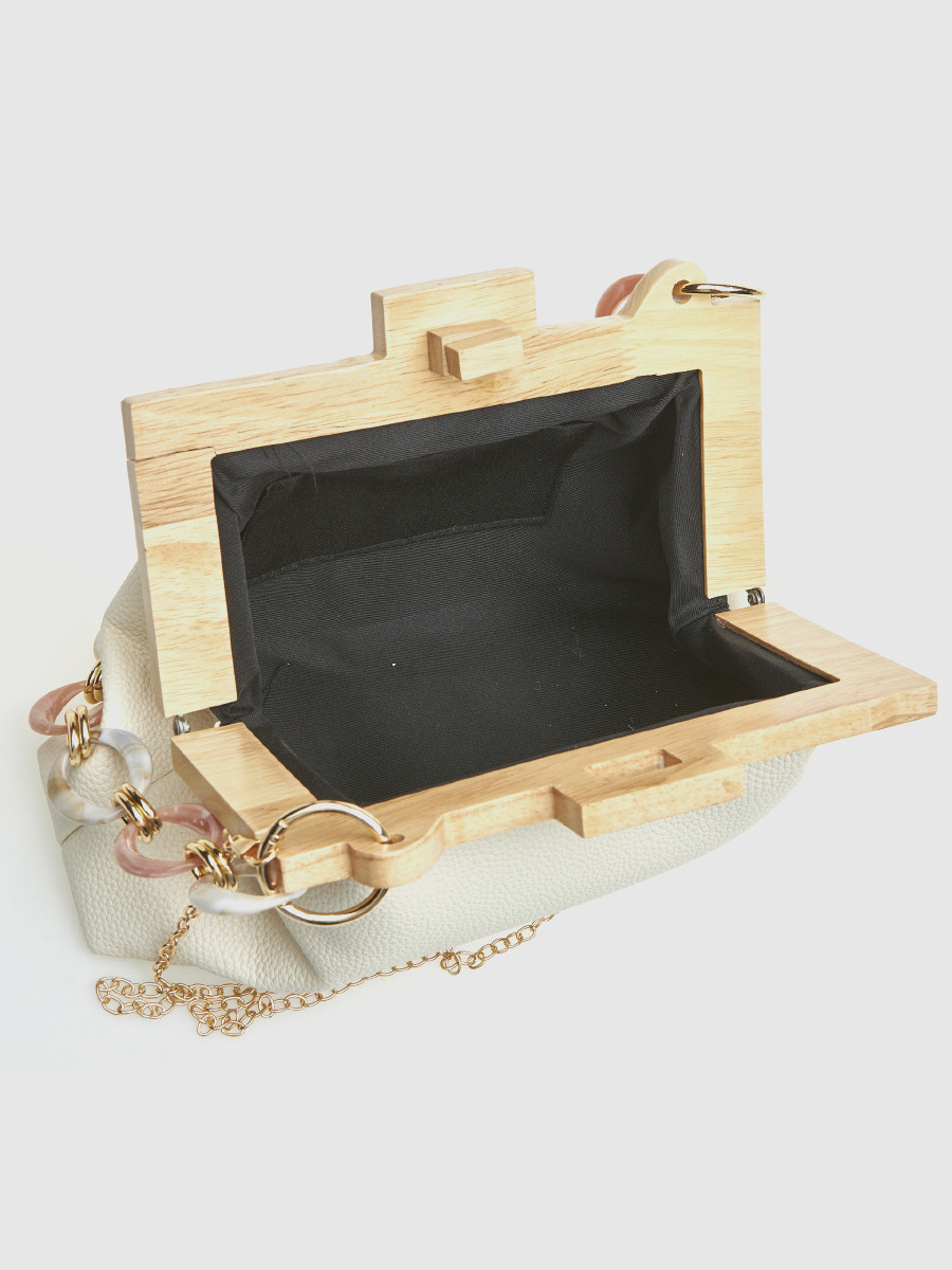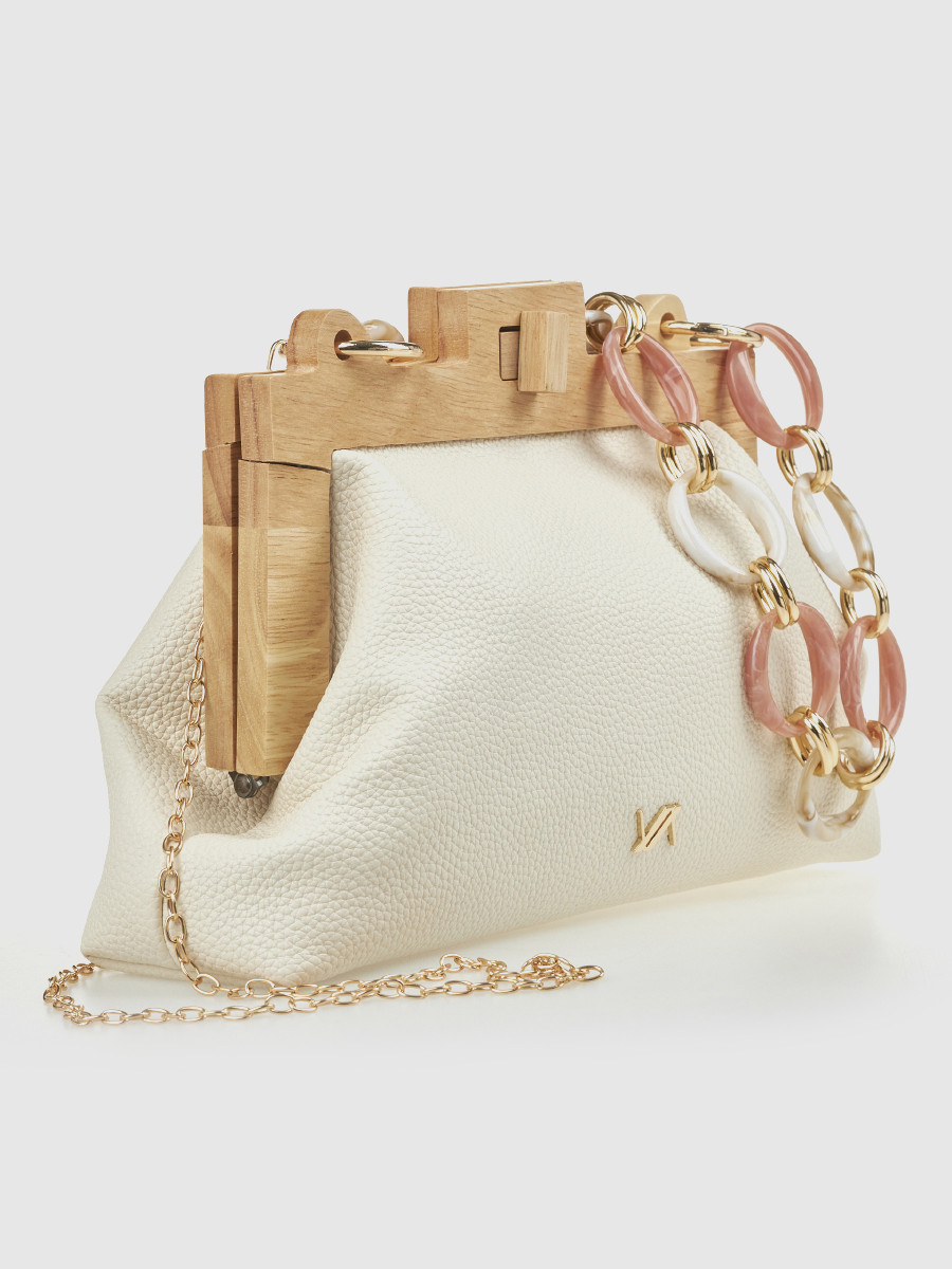Ανακαλύψτε το απόλυτα κομψό και ιδιαίτερο γυναικείο τσαντάκι αμπιγιέ Verde σε εκρού απόχρωση, που συνδυάζει μοντέρνα αισθητική με διαχρονική φινέτσα. Το μοναδικό του design με ξύλινο πλαίσιο δημιουργεί ένα εντυπωσιακό αποτέλεσμα, ενώ παράλληλα προσθέτει μία φυσική πινελιά πολυτέλειας σε κάθε σας εμφάνιση.