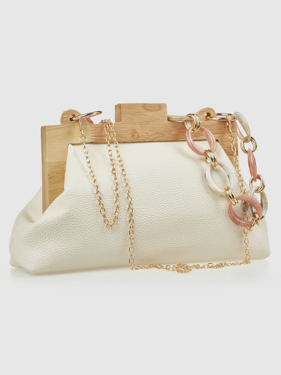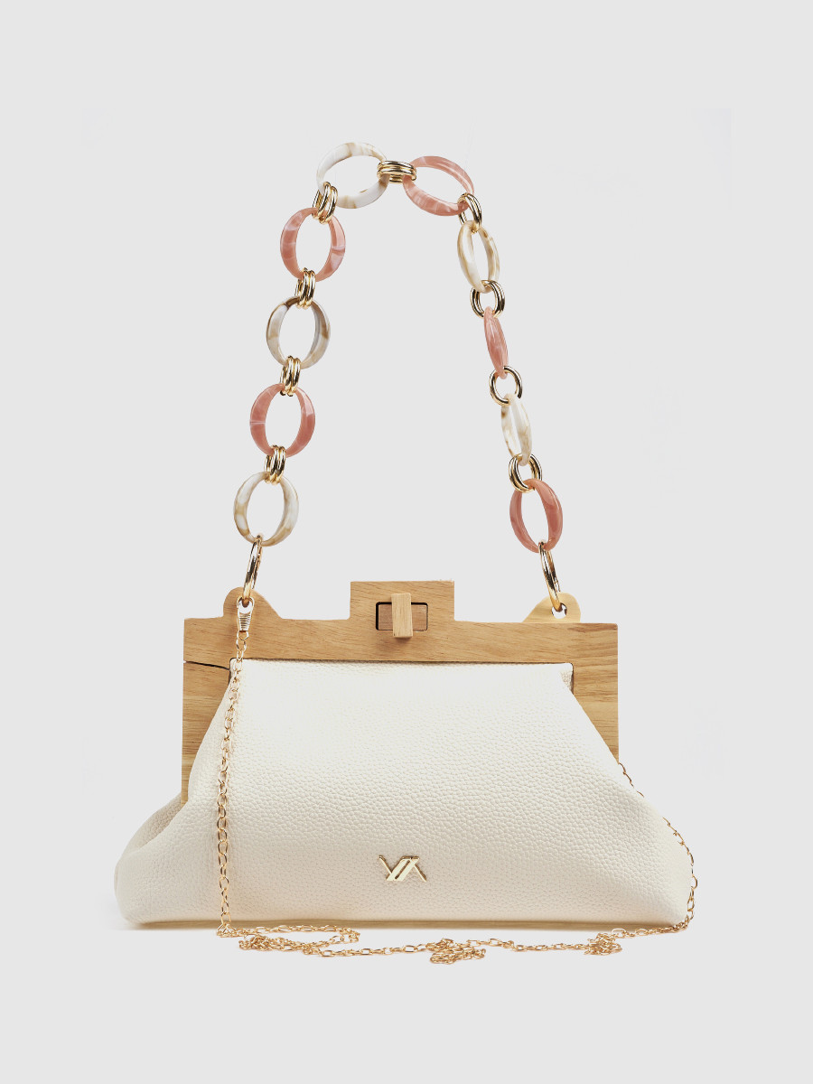 Το συγκεκριμένο τσαντάκι ξεχωρίζει άμεσα χάρη στη δομημένη του μορφή, αλλά και τη διακοσμητική αλυσίδα με λεπτομέρειες σε απαλούς ροζ και λευκούς τόνους. Επιπλέον, η εκρού απόχρωση το καθιστά εξαιρετικά ευέλικτο, καθώς μπορείτε να το συνδυάσετε εύκολα τόσο με βραδινά όσο και με πιο chic καθημερινά σύνολα.