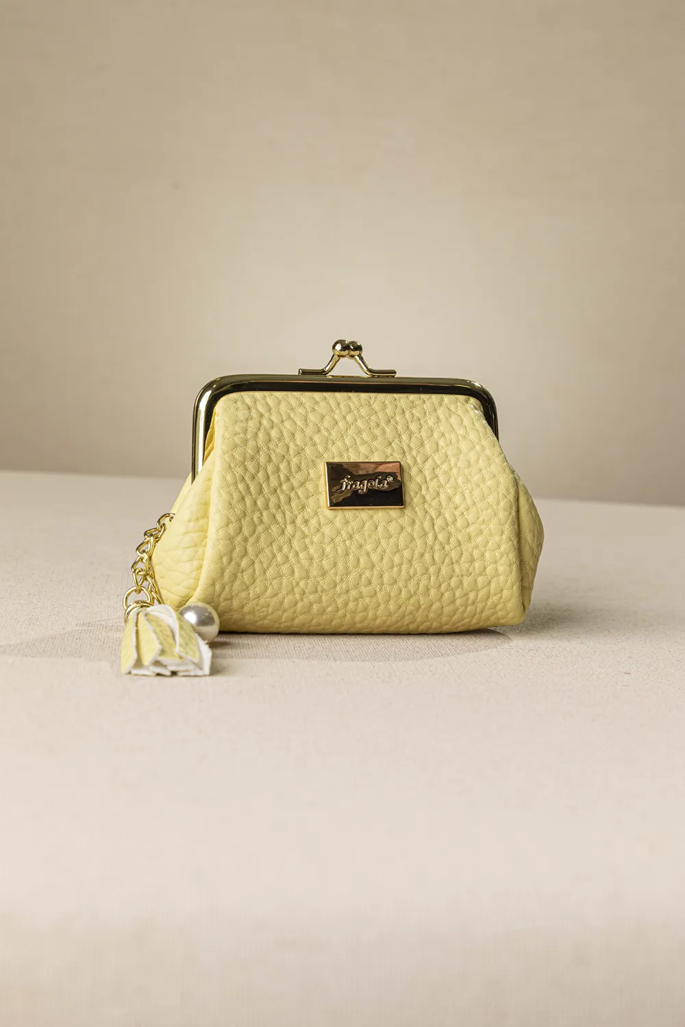 Φοδραρισμένη κερματοθήκη με έναν ενιαίο χώρο που κλείνει με μεταλλικό στόμιο. Διακοσμητική φούντα και πέρλα, που προσδίδει κάτι ξεχωριστό και χαριτωμένο.