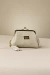 Φοδραρισμένη κερματοθήκη με έναν ενιαίο χώρο που κλείνει με μεταλλικό στόμιο. Διακοσμητική φούντα από συνθετικό υλικό και πέρλα, που προσδίδει κάτι ξεχωριστό και χαριτωμένο.