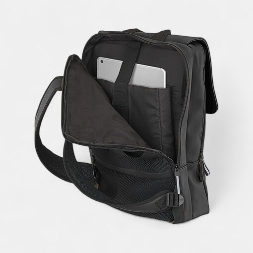Μεγάλη πίσω θέση, πλήρως φοδραρισμένη, με αδιάβροχο φερμουάρ και ειδική θήκη για Laptop έως 16 ιντσών – εξασφαλίζει απόλυτη προστασία κατά τη μεταφορά.