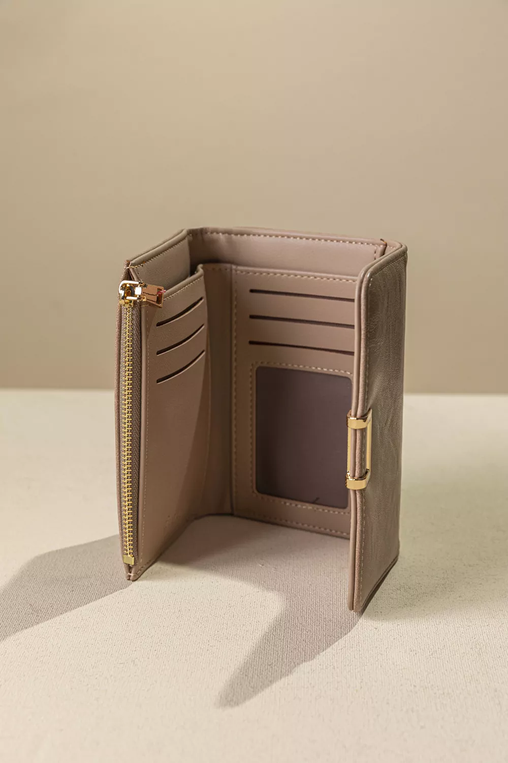 • Ο minimal σχεδιασμός του με το χρυσό μεταλλικό κούμπωμα χαρίζει μια διακριτική πολυτέλεια. Το εσωτερικό του είναι πρακτικά οργανωμένο με πολλαπλές θέσεις για κάρτες, διάφανη θήκη για ταυτότητα ή δίπλωμα, καθώς και ξεχωριστό χώρο για χαρτονομίσματα.