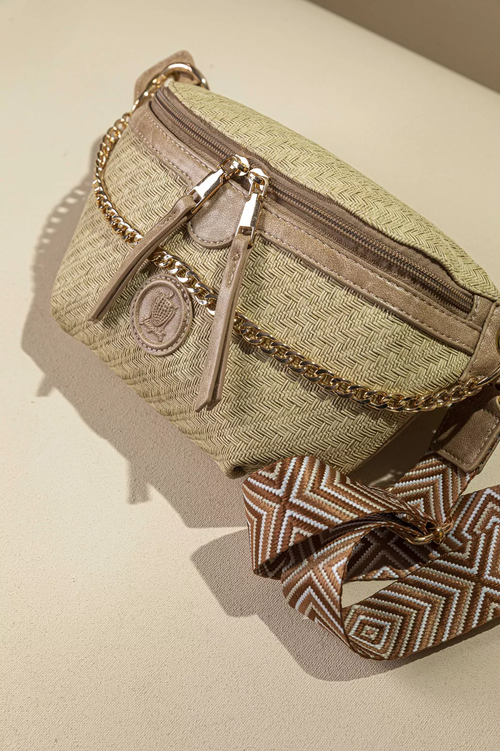 • Crossbody μεσαίου μεγέθους. Στην κεντρική θέση διαθέτει τα κλασικά τσεπάκια στη φόδρα. Προσαρμογή στη μέση ή στον ώμο. • Μονόχρωμος ιμάντας με δυνατότητα αυξομείωσης. Εντυπωσιακά pullers ίδια με το υλικό του φινιρίσματος για εύκολο άνοιγμα! • Η τροχισμένη αλυσίδα στο μπροστινό της μέρος δίνει μια πιο elegant πινελιά, όμως ταυτόχρονα είναι και αποσπώμενη. Υλικό: Συνθετική δερματίνη με μορφη ψάθας