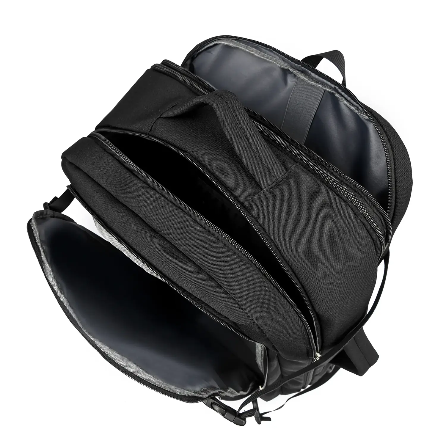 Το σακίδιο διαθέτει structured, ορθογώνιο σχήμα που μεγιστοποιεί τον εσωτερικό χώρο ενώ παραμένει εντός των επιτρεπόμενων διαστάσεων καμπίνας. Η κύρια μπροστινή ζώνη φέρει δύο διαφορετικά compartments με φερμουάρ — ένα μεγαλύτερο για καθημερινά αντικείμενα και ένα μικρότερο οργανωτικό — ενώ δύο πλευρικές τσέπες φερμουάρ προσφέρουν γρήγορη πρόσβαση σε παγούρι, καλώδια ή μικρά αντικείμενα.