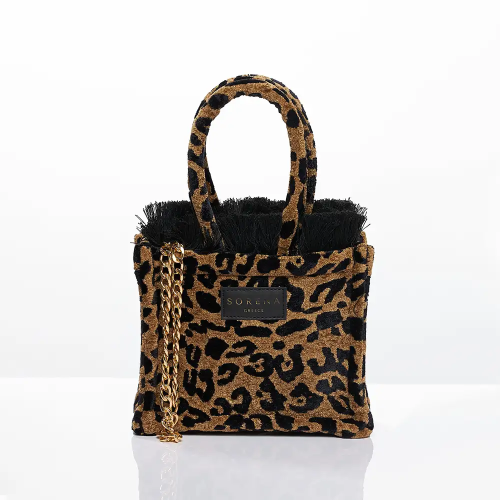 Η Sorena Velvet Brown Small είναι μια χειροποίητη mini tote τσάντα χειρός με διαστάσεις 20×17cm. Διαθέτει φερμουάρ ασφαλείας, πολυτελές velvet εσωτερικό, τον χαρακτηριστικό ιμάντα Sorena και συνοδεύεται από προστατευτική dust bag. Μια μικρή αλλά κομψή επιλογή που ταιριάζει ιδανικά σε καθημερινές και βραδινές εμφανίσεις.