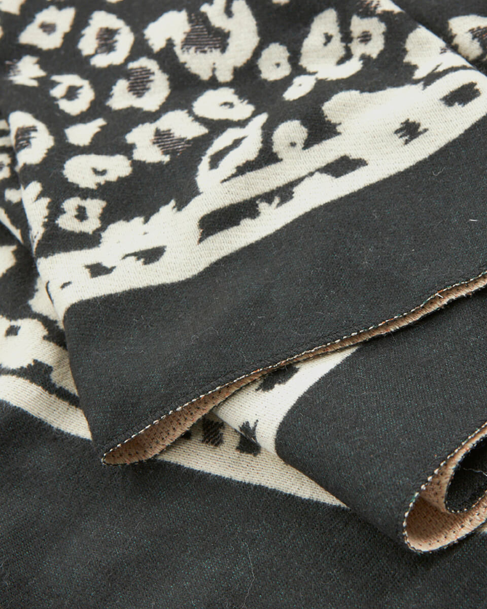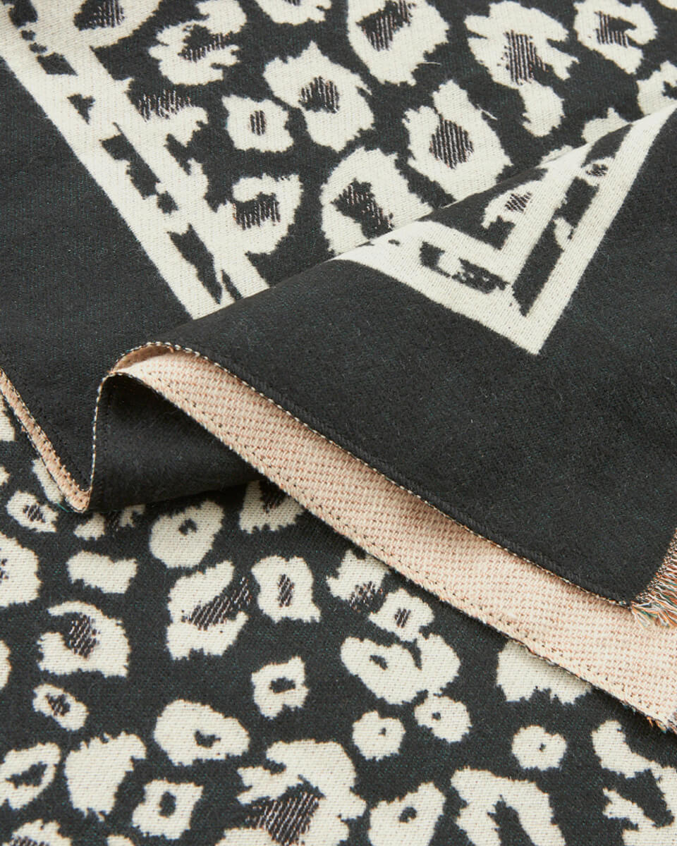 Women's animal print scarf by Verde, featuring a striking dual leopard pattern in black and brown tones. Soft to the touch and lightweight, with a stylish fringed edge for a polished finish.