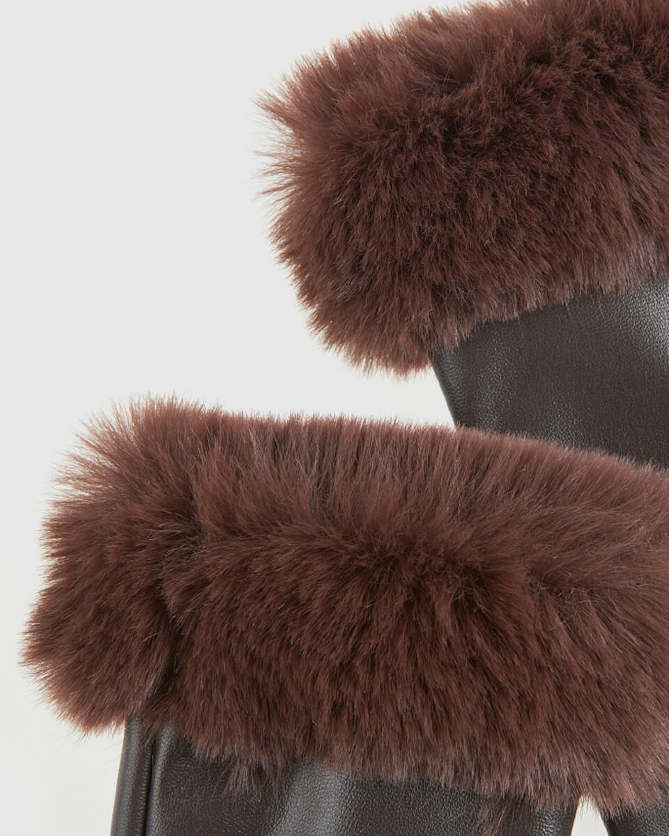 Η καφέ απόχρωση χαρίζει ζεστό τόνο, ενώ το γουνάκι στο τελείωμα προσθέτει μια κομψή και εκλεπτυσμένη λεπτομέρεια.