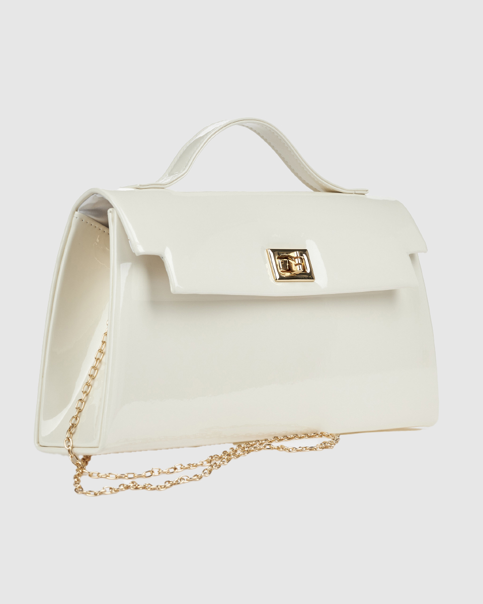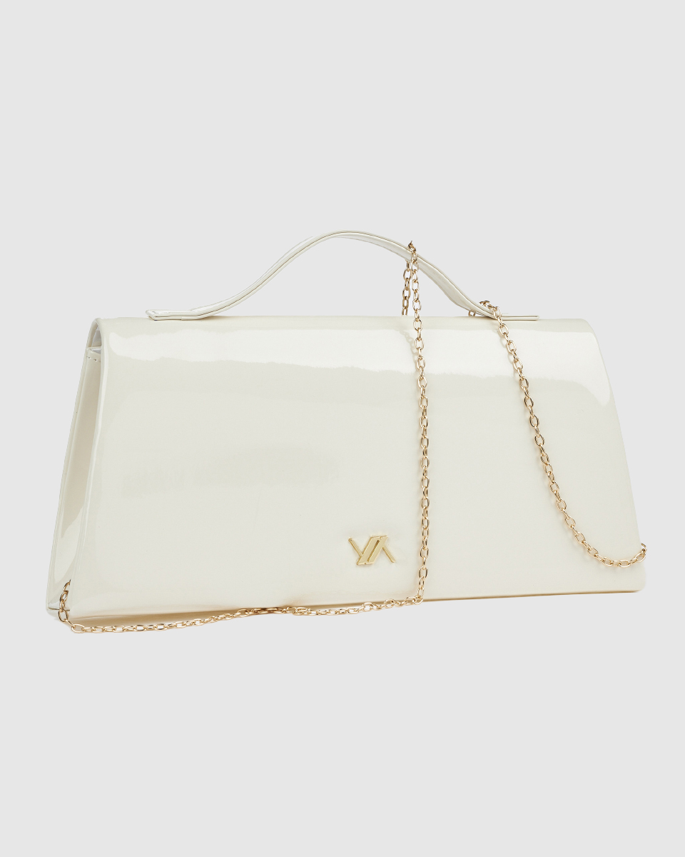 Το συγκεκριμένο clutch Verde ξεχωρίζει για τον εκλεπτυσμένο σχεδιασμό του αλλά και για τη γυαλιστερή υφή του συνθετικού δέρματος που προσδίδει πολυτελή χαρακτήρα. Το καπάκι που κλείνει με μεταλλικό κούμπωμα εξασφαλίζει ασφαλές κλείσιμο, ενώ ταυτόχρονα λειτουργεί ως κομψή μεταλλική λεπτομέρεια που ολοκληρώνει το design της τσάντας.