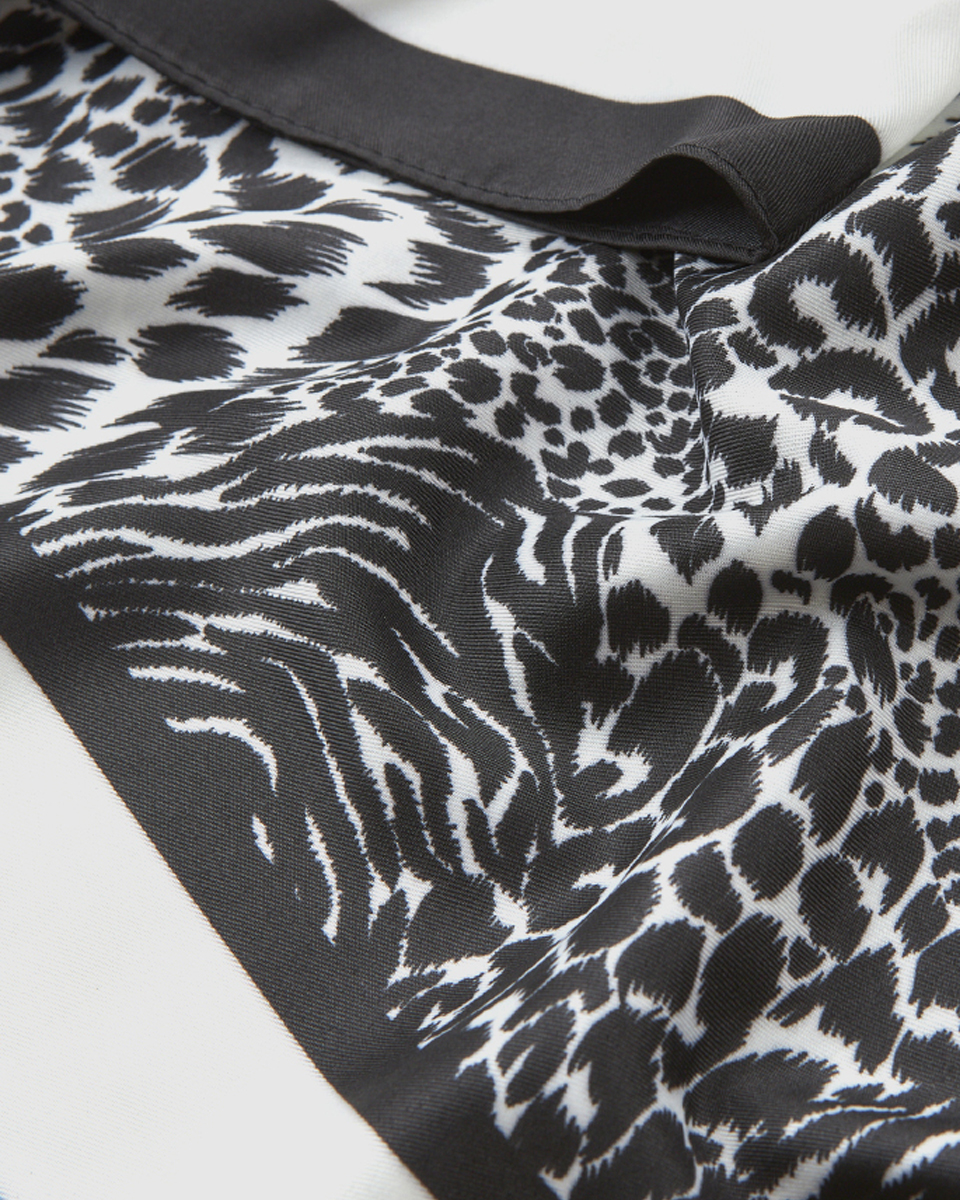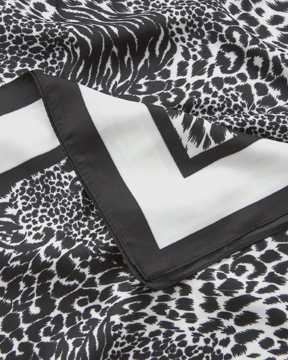 Κομψή γυναικεία εσάρπα Verde σε animal print ασπρόμαυρο σχέδιο που προσθέτει δυναμικό χαρακτήρα σε κάθε εμφάνιση. Κατασκευασμένη από πολυεστέρα με απαλή υφή και κομψό τετράγωνο σχήμα για ευέλικτους συνδυασμούς.
