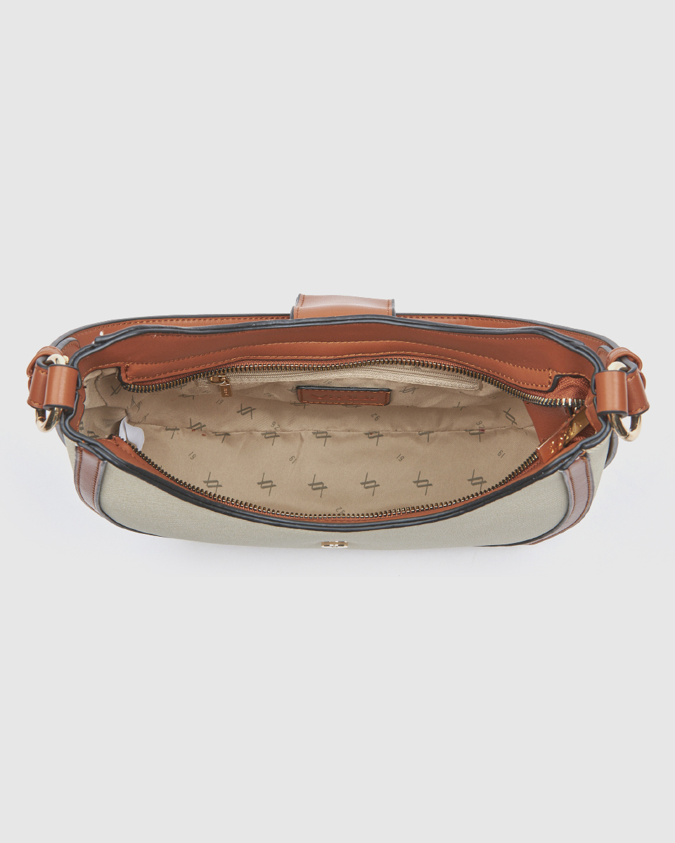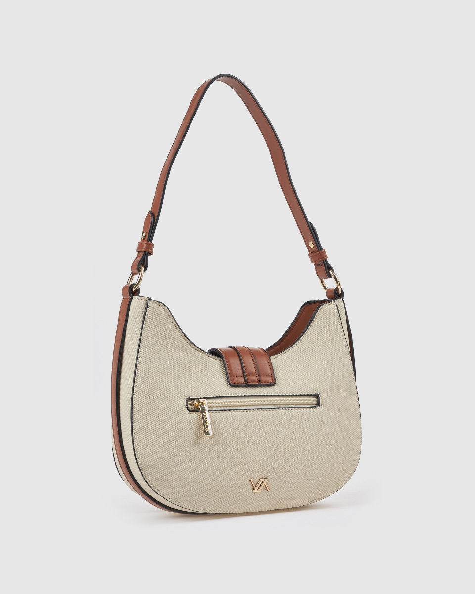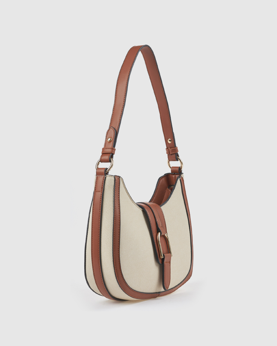 Το καμηλό χρώμα συνδυάζεται άψογα με τις καφέ λεπτομέρειες, προσφέροντας ένα αρμονικό και διαχρονικό αισθητικό αποτέλεσμα. Παράλληλα, η υφασμάτινη όψη ενισχύει το φυσικό στυλ της τσάντας και προσθέτει μία ιδιαίτερη υφή που τραβά το βλέμμα.