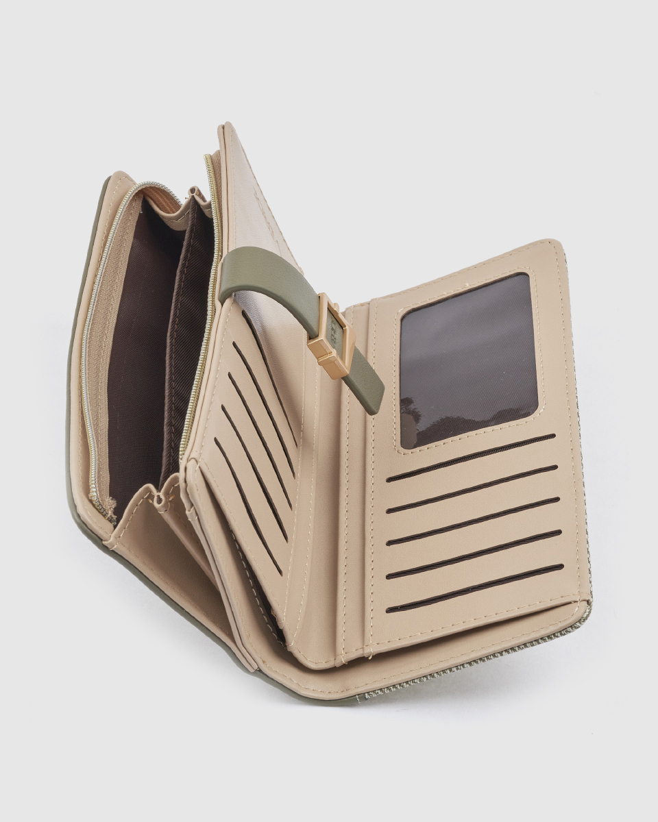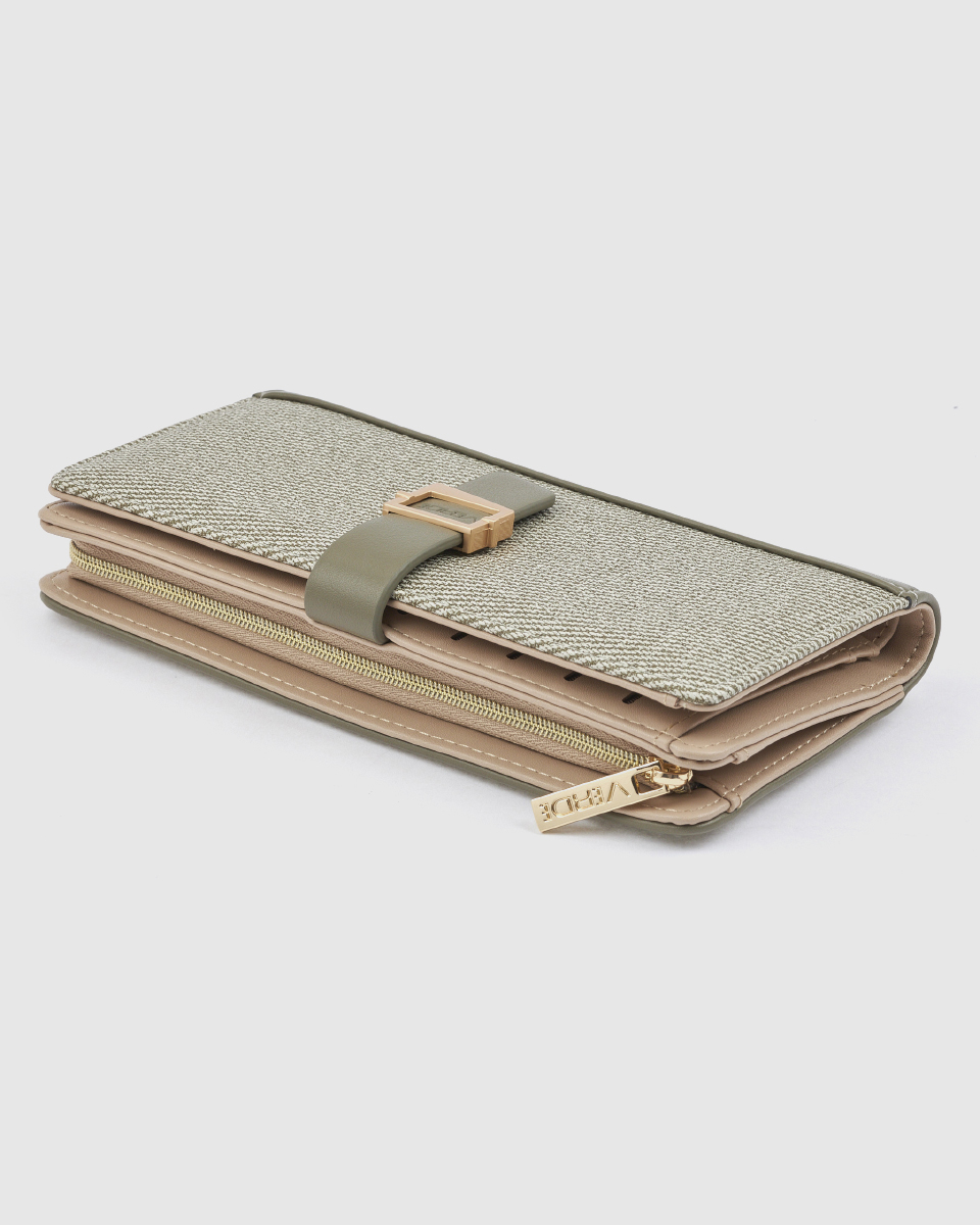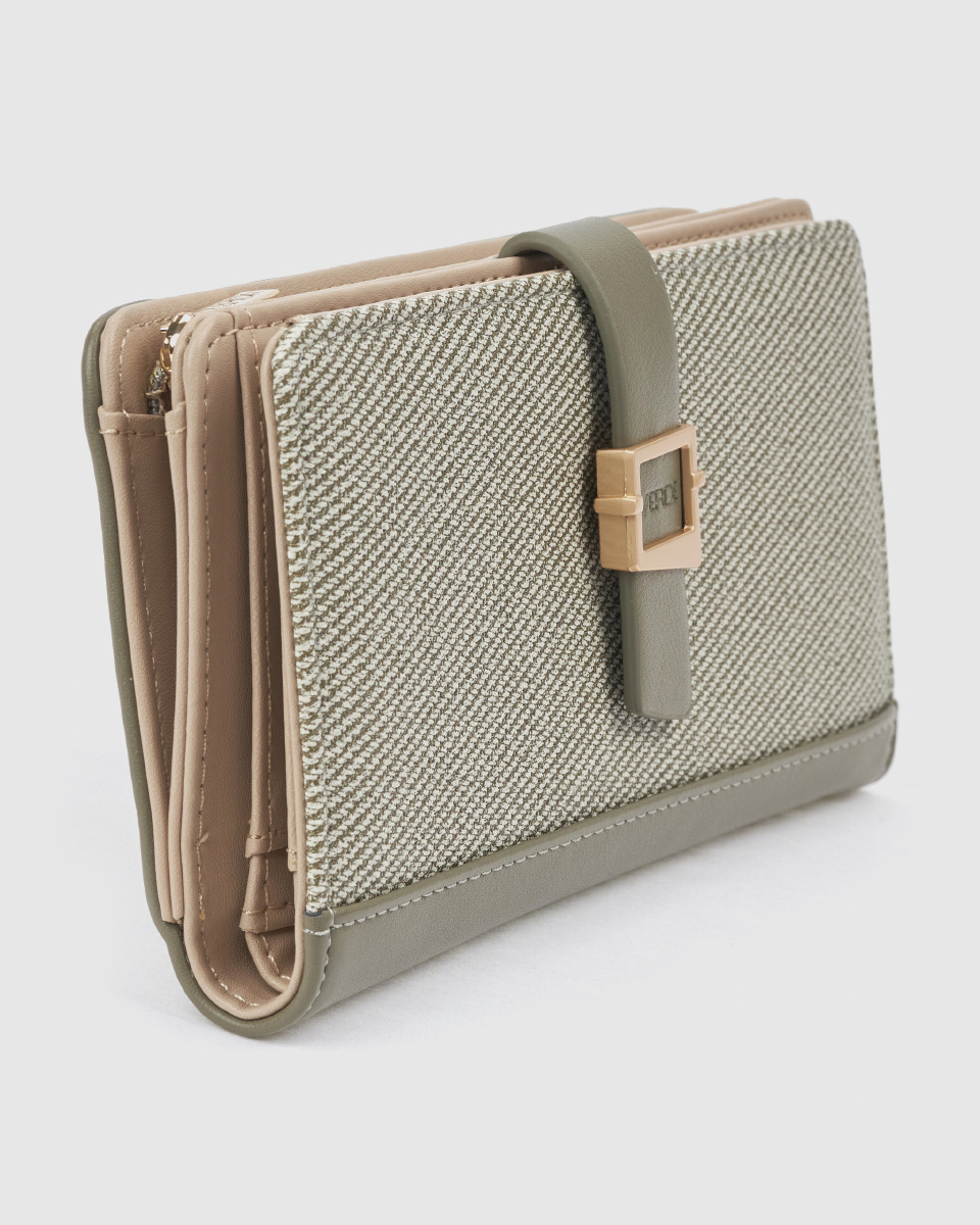 Ανακαλύψτε το κομψό και λειτουργικό γυναικείο πορτοφόλι Verde σε χακί απόχρωση, που συνδυάζει αρμονικά τη μοντέρνα αισθητική με την καθημερινή πρακτικότητα. Το ιδιαίτερο design με υφασμάτινη υφή και λεπτομέρειες σε συνθετικό δέρμα δημιουργεί ένα διαχρονικό και ταυτόχρονα σύγχρονο αποτέλεσμα.