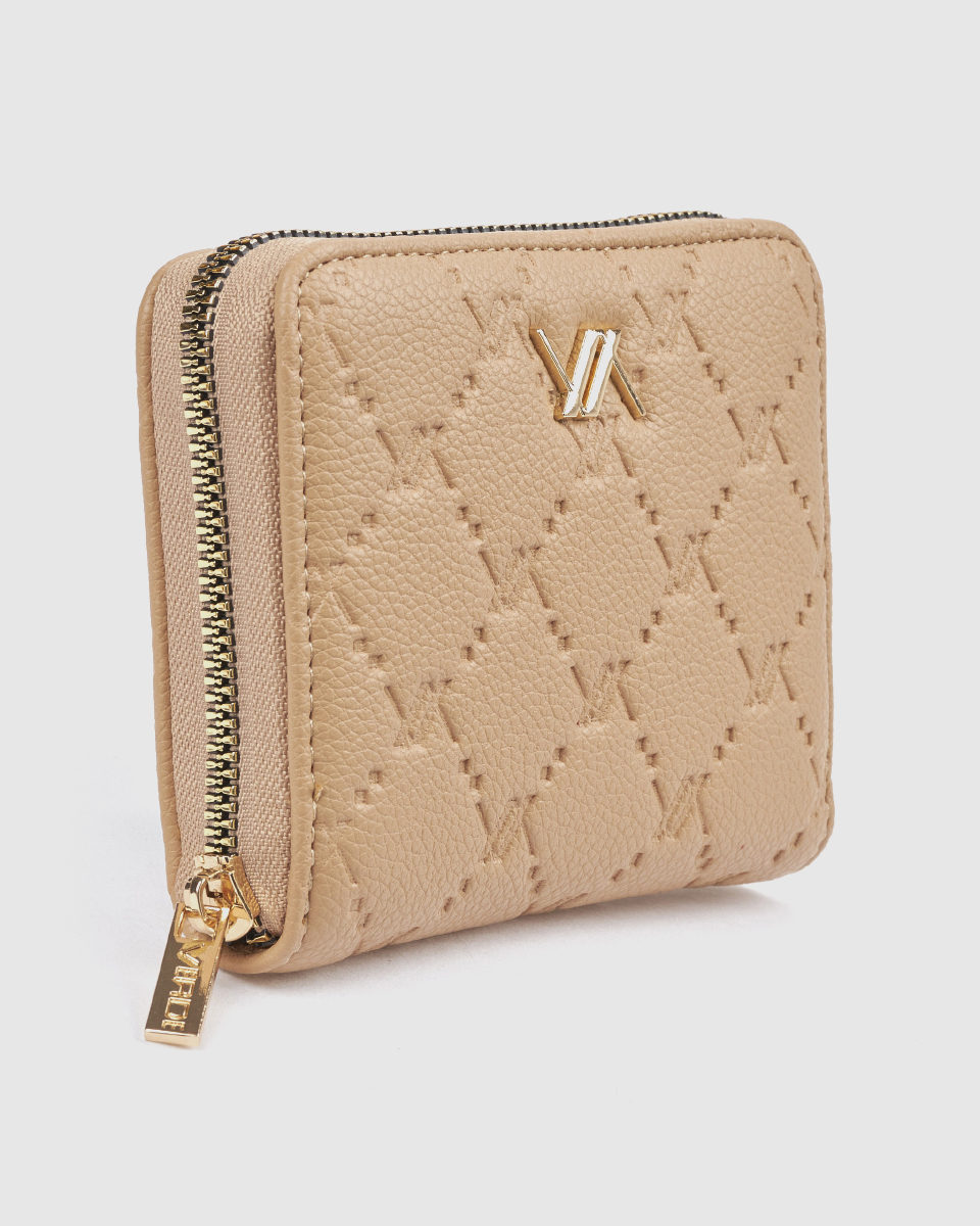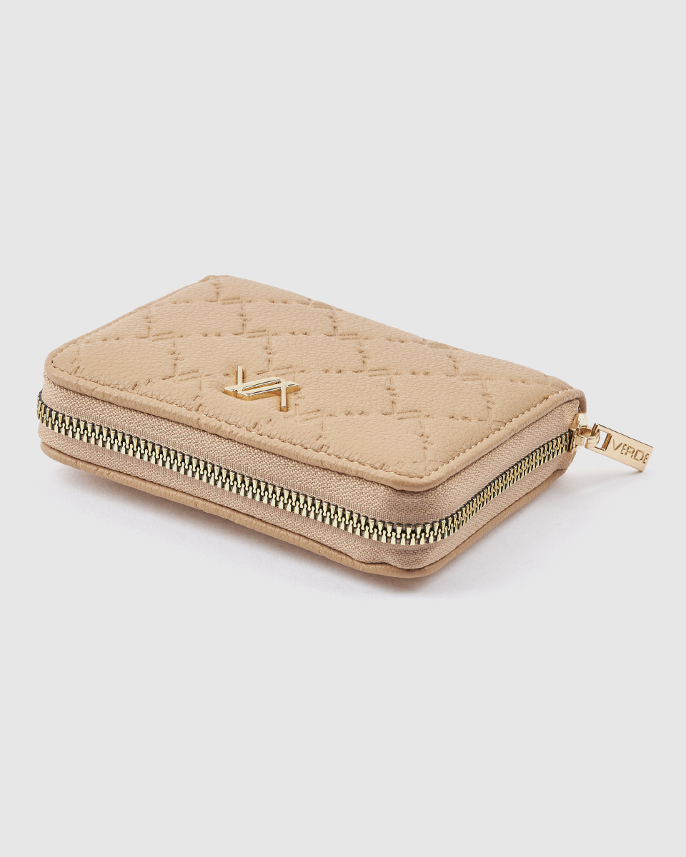 Ανακαλύψτε το γυναικείο πορτοφόλι Verde μπεζ με ανάγλυφο σχέδιο και περιμετρικό φερμουάρ. Διαστάσεις: 12,5 εκ. x 10 εκ. x 3 εκ.