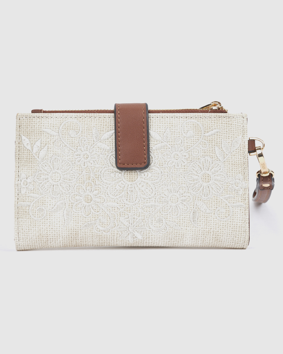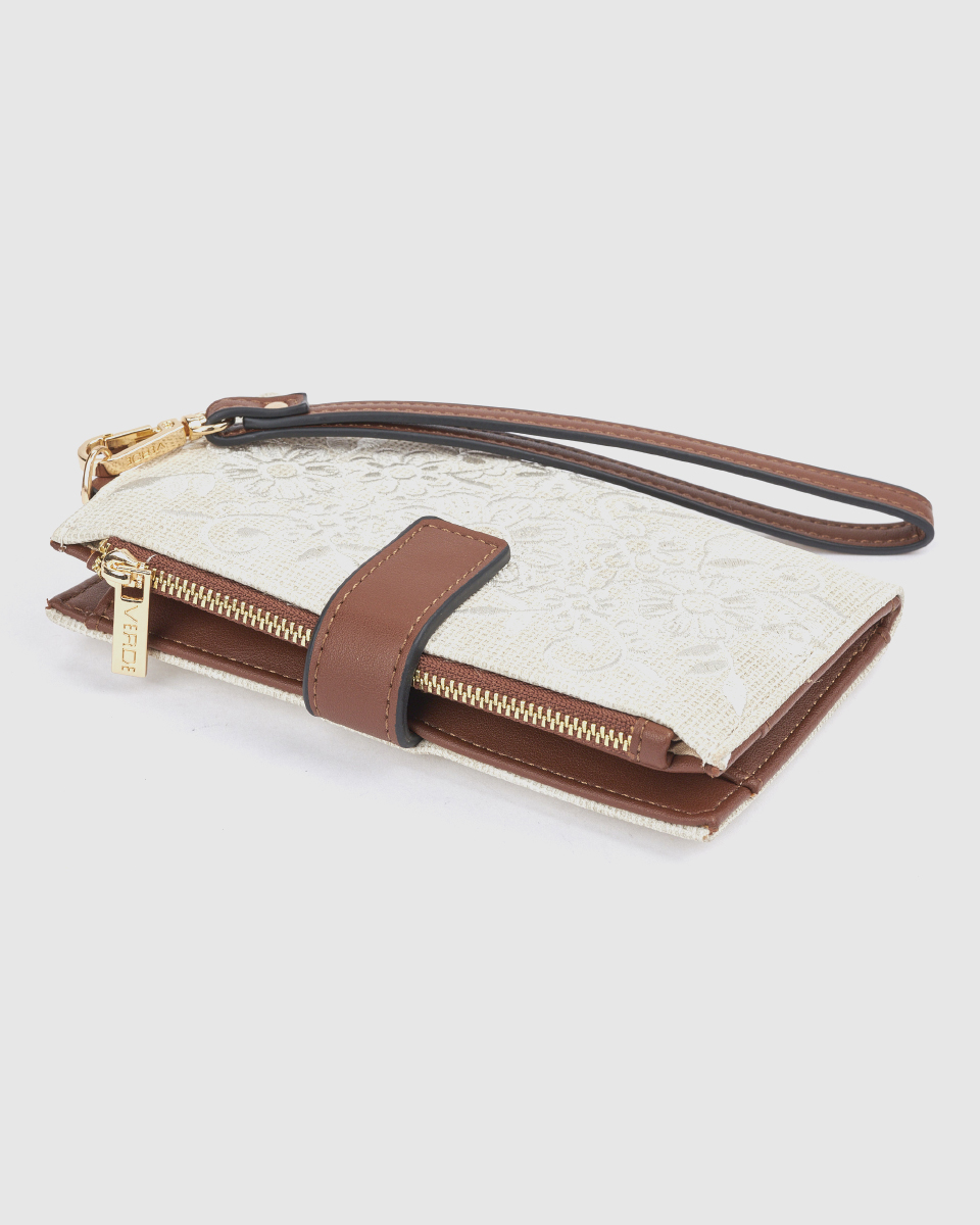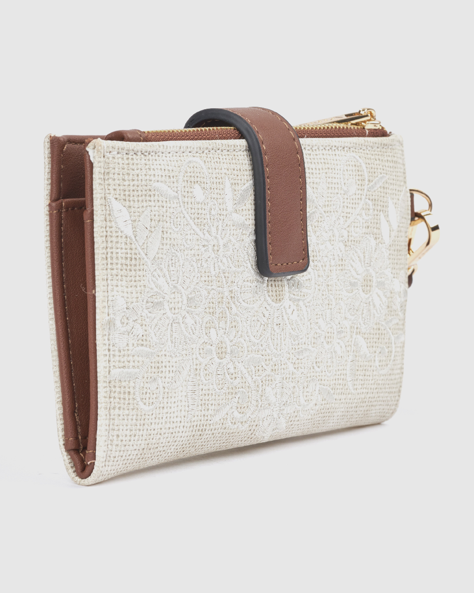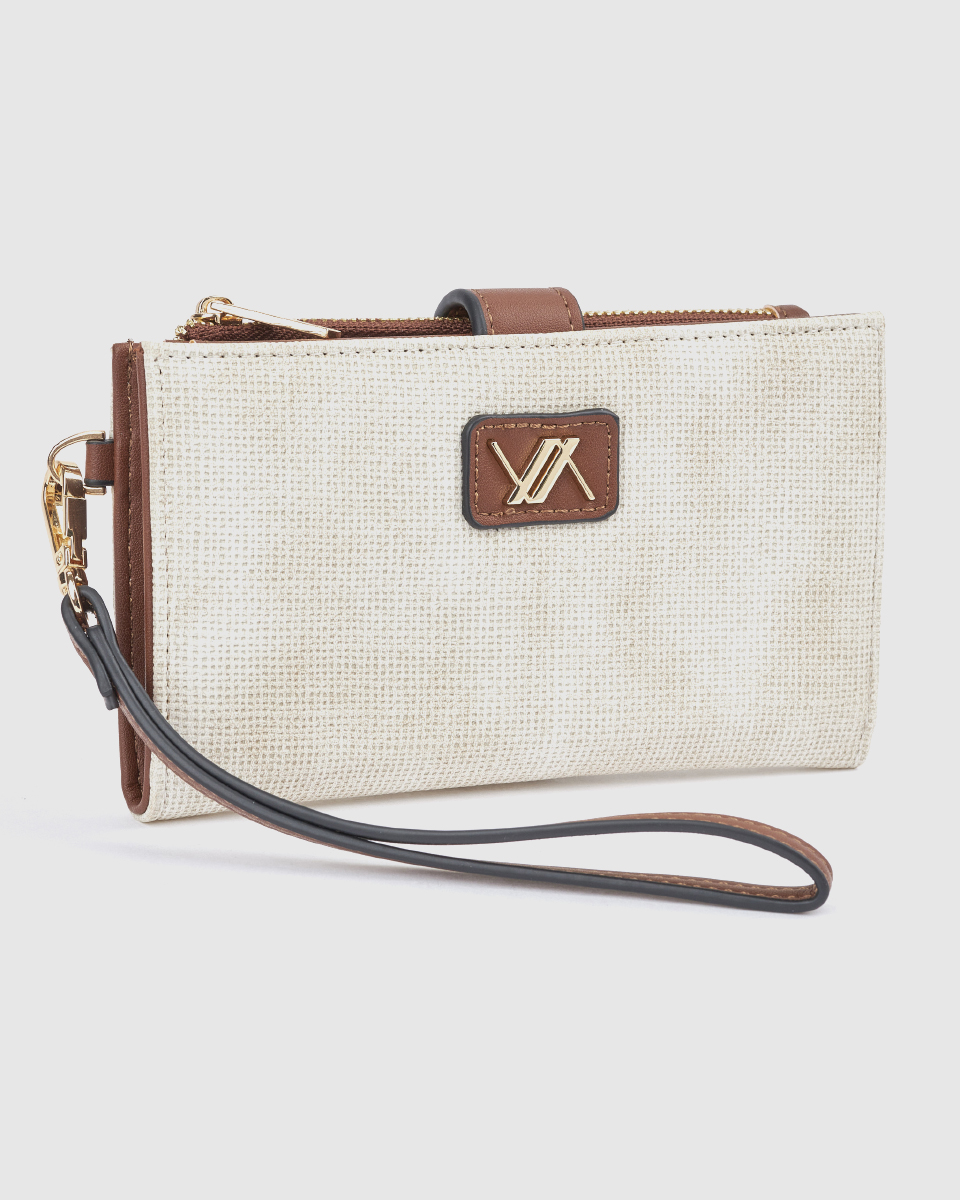 Ανακαλύψτε το γυναικείο πορτοφόλι Verde σε εκρού απόχρωση, ένα ιδιαίτερο και κομψό αξεσουάρ που συνδυάζει φυσική υφή, minimal αισθητική και εξαιρετική λειτουργικότητα. Το μοναδικό ανάγλυφο σχέδιο στην επιφάνειά του χαρίζει μία διακριτική πολυτέλεια, ενώ οι καφέ λεπτομέρειες δημιουργούν μία ζεστή και αρμονική αντίθεση.